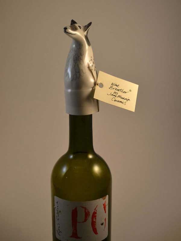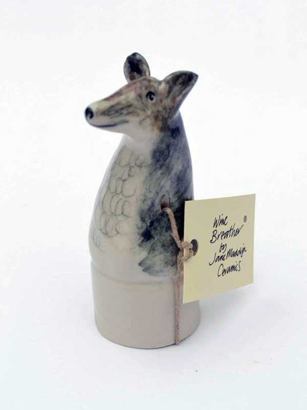 This Lithe Lurcher is part of my range of Winebreathers, can also be used as wine bottle caps. These are sculptural pieces designed to sit on a bottle of red wine after the cork has been removed to allow the wine to breathe. The wine breathes but the pesky little fruit flies can’t get in to ruin it. each one is hand decorated by my illustrator husband kevin maddison, so each one is slightly different and original, a collectable item.