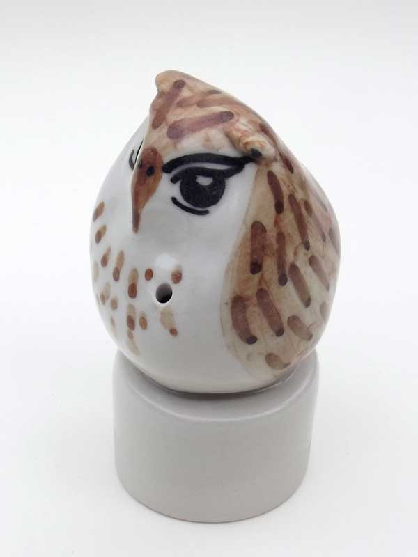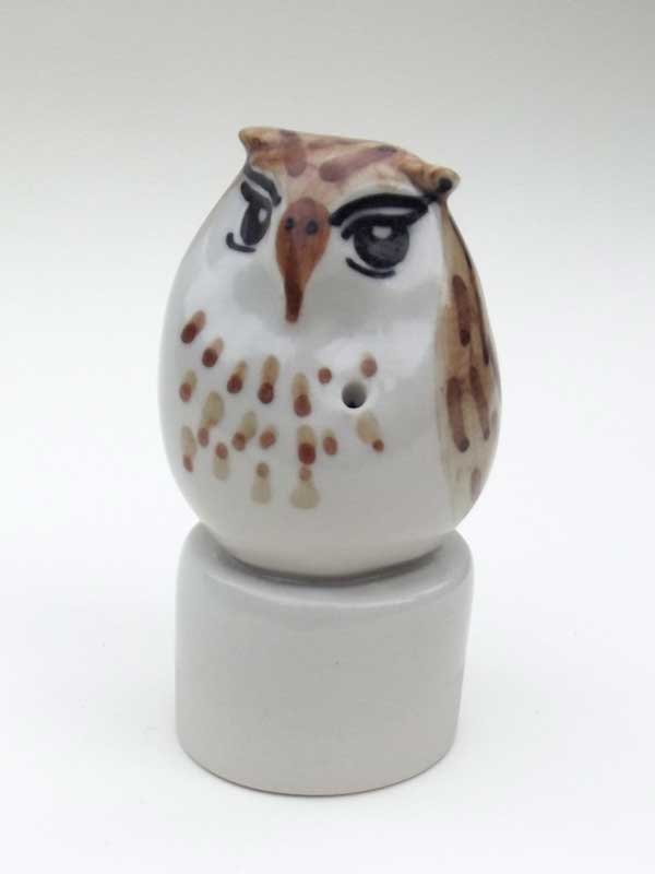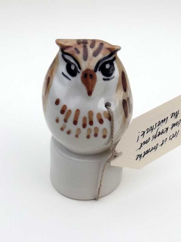 This Owl is part of my range of Winebreathers. These are sculptural pieces designed to sit on top of a bottle of red wine after the cork has been removed to allow the wine to breathe. The wine breathes but the pesky little fruit flies can’t get in to ruin it.This can also be used as a wine bottle cap if half the bottle is left ! Each one is hand decorated by my illustrator husband Kevin Maddison, so each one is slightly different and original, a collectable item.