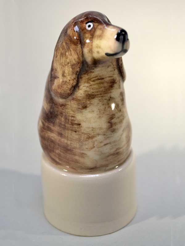 This cheeky Cocker Spaniel is part of my range of Winebreathers. These are sculptural pieces designed to sit on top of a bottle of wine after the cork has been removed to allow the wine to breathe. The wine breathes but the pesky little fruit flies can’t get in to ruin it. This can be used as a wine bottle cap if half the wine is left ! each one is hand decorated by my illustrator husband Kevin Maddison, so each one is slightly different and original, a collectible item.