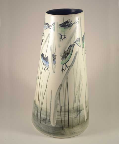 As you might expect with Jane’s hand decorated ceramics, these exquisite vases are all unique, no two are exactly alike, this one features blue and green birds in the trees.