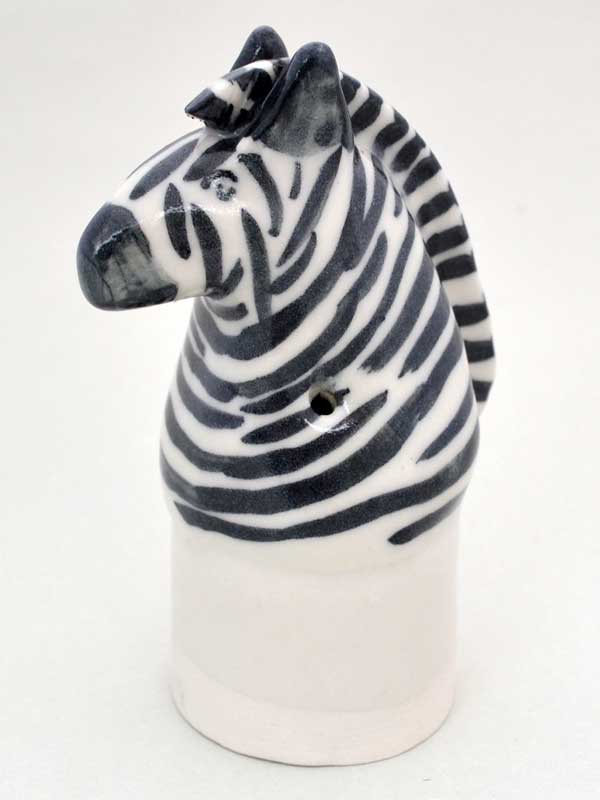 This zany stripey Zebra is part of my range of Winebreathers. These are sculptural pieces designed to sit on top of a bottle of red wine after the cork has been removed to allow the wine to breathe. The wine breathes but the pesky little fruit flys can’t get in to ruin it.This can also be used as a wine bottle cap if half the bottle is left ! Each one is hand decorated by my illustrator husband Kevin Maddison, so each one is slightly different and original, a collectable item.